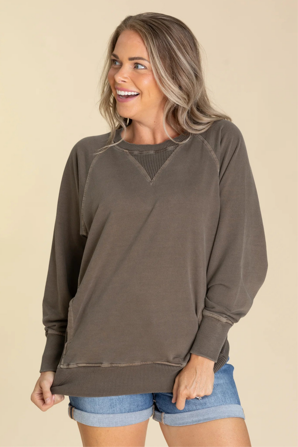 This comfy sweatshirt is made from 100% French Terry Cotton with a unique pigment dye wash. The pigment dye wash makes each sweatshirts' wash slightly different. It's crafted with fun stitching details, ribbed accents, and side pockets. Perfect for cool mornings or chilly evenings.
