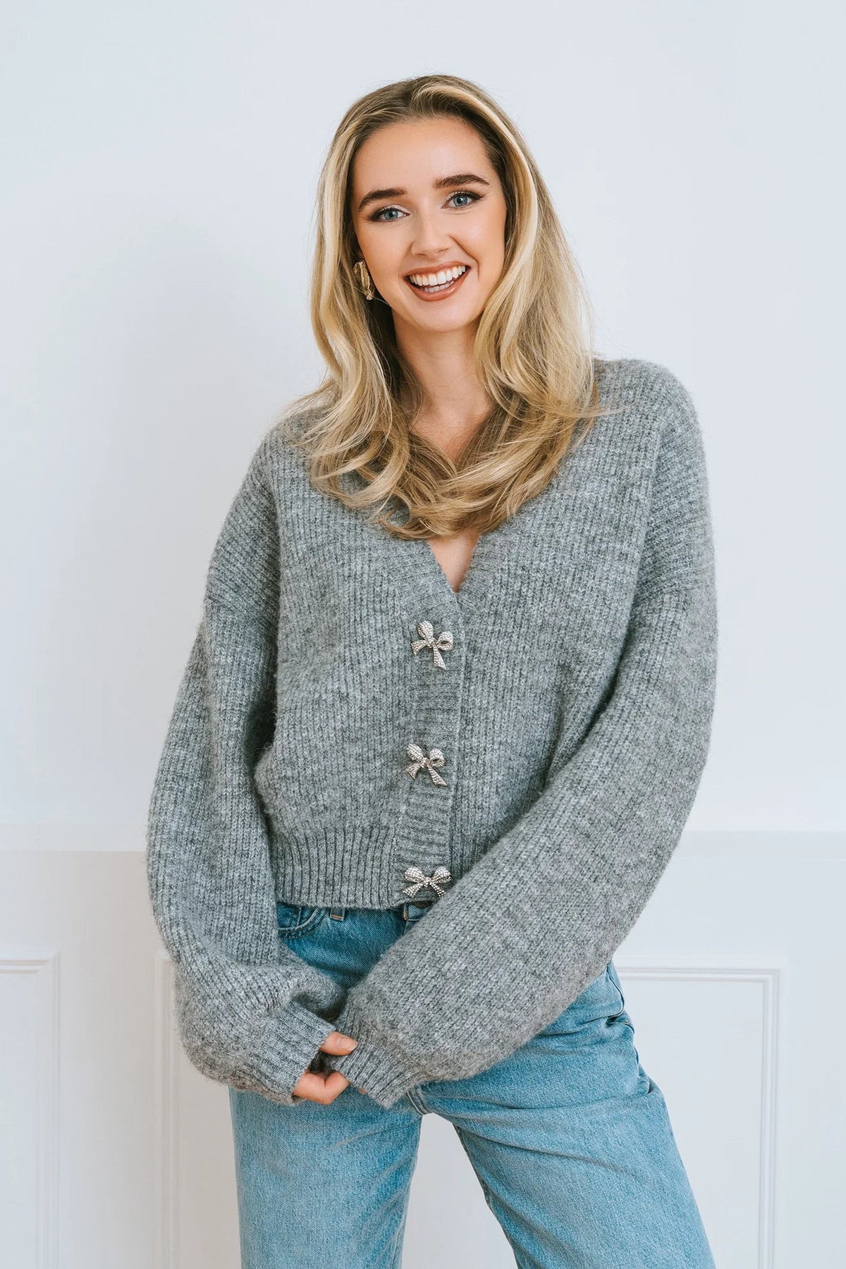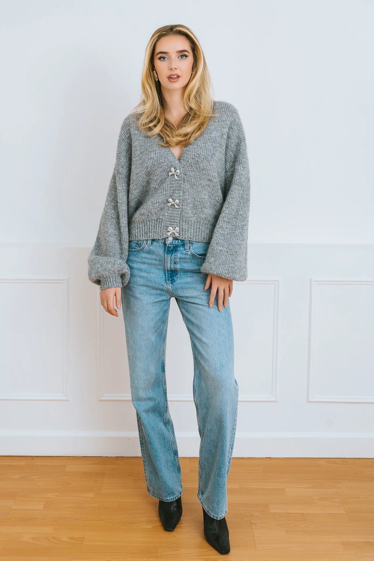 Meet our Grace Cardigan, an elegant V-neck style finished with removable brooch-style crystal bow buttons along the center front. The relaxed body and statement sleeves create an effortlessly chic silhouette, perfect for layering or wearing on its own.