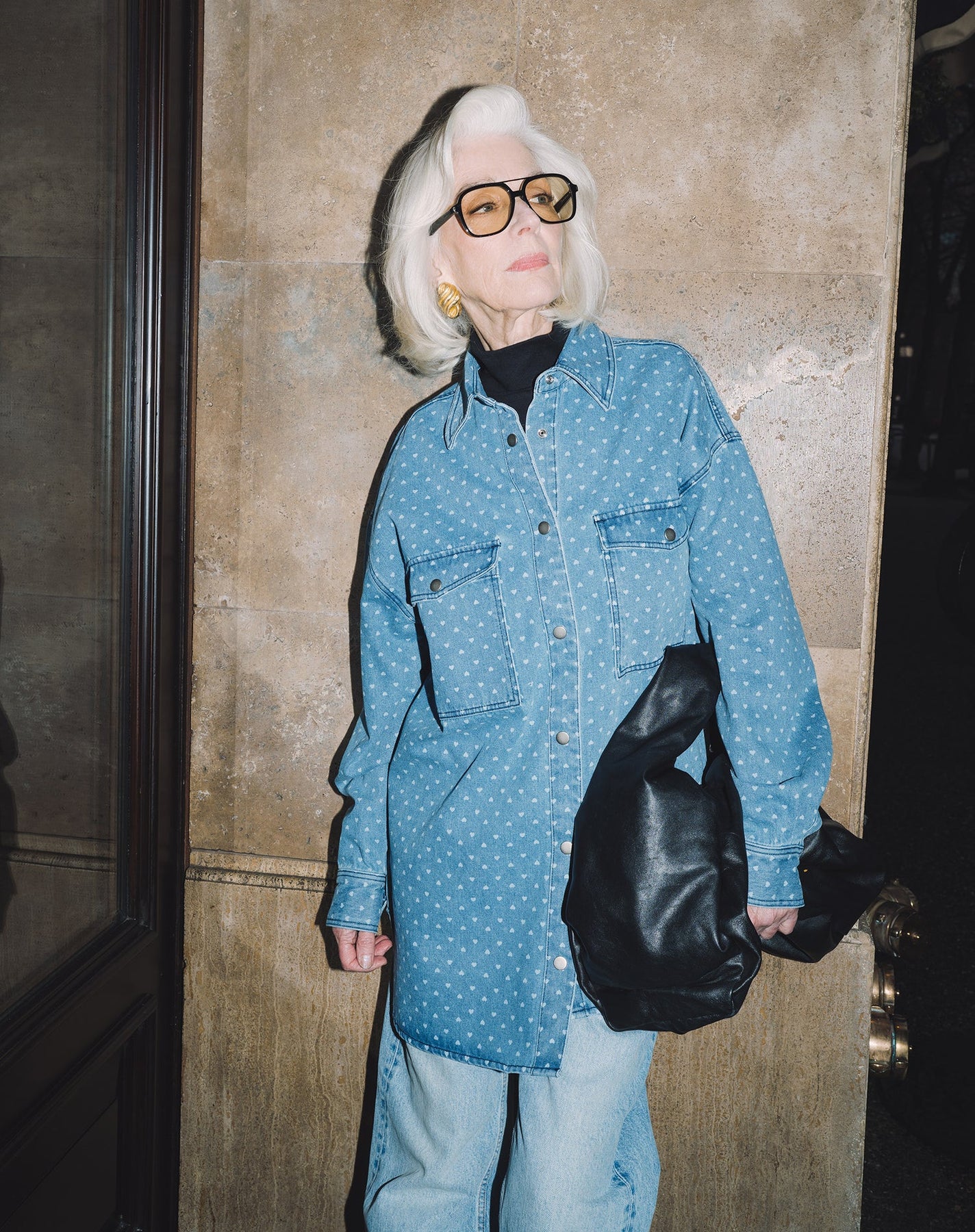 Our Denim Heart Jacket is 90% cotton and 10% polyester with vintage-inspired brushed silver hardware, dropped shoulder and two front chest pockets. She is truly an oversized fit with a wide and long body.