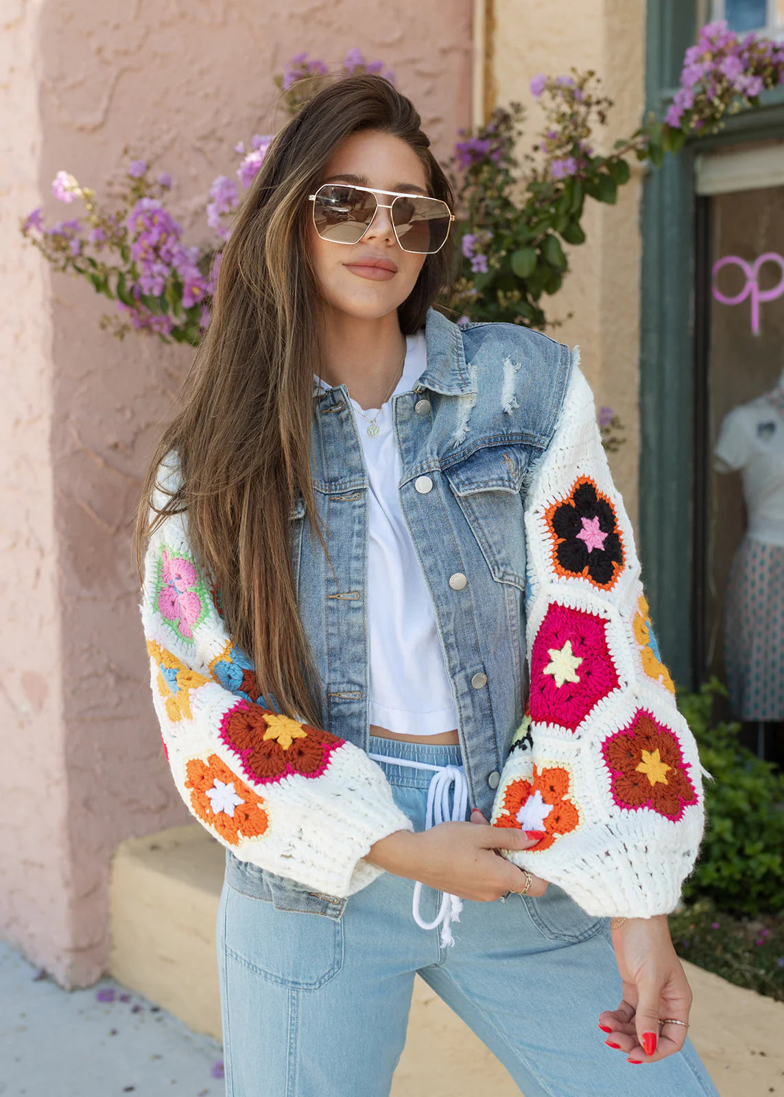 This denim jacket features beautiful floral crochet sleeves that add a pop of colour and texture. Designed with a classic button-front closure, it’s an easy layering piece that elevates any outfit. Perfect for adding a unique, standout touch to everyday looks.