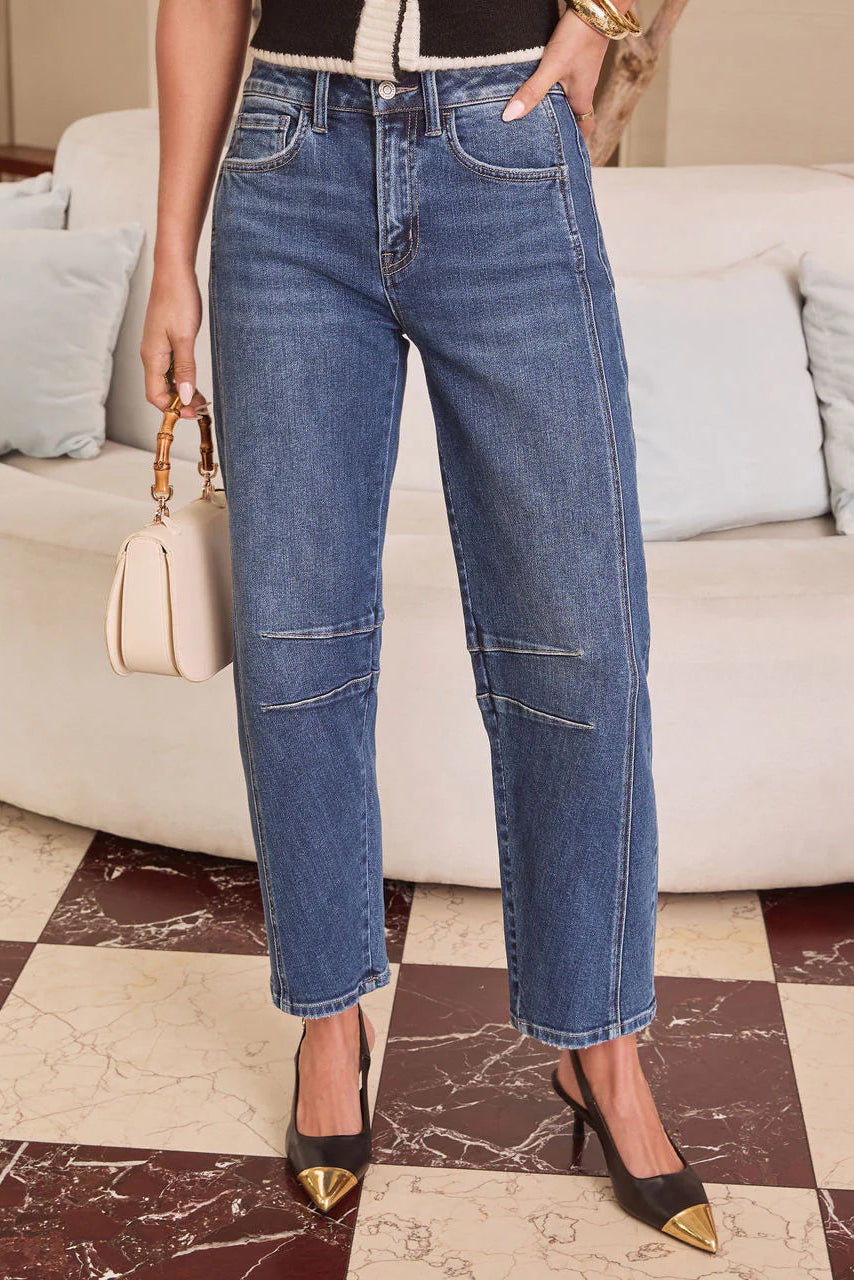 These jeans are made from comfort stretch denim with a flattering high-rise fit. Designed with a trendy barrel leg and ankle-length cut, they offer effortless style with all-day comfort.