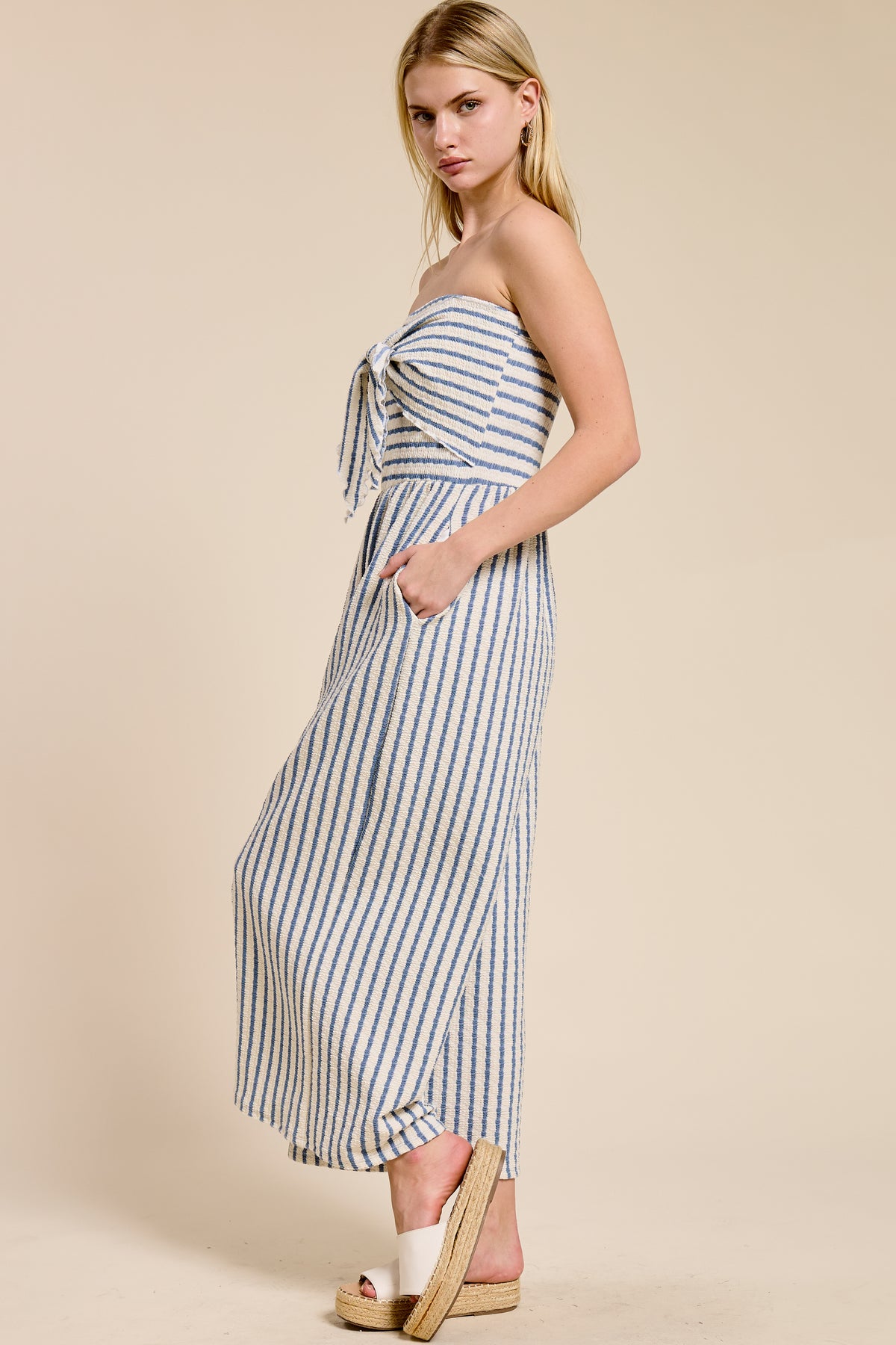Designed with an effortless strapless silhouette, this striped jumpsuit is crafted from a soft, stretchy fabric with subtle texture for added dimension and comfort. The softly structured bodice features a front tie detail that creates gentle shape, while the pull-on design allows for easy on-and-off wear. Finished with a relaxed wide-leg cut, this one-and-done piece moves beautifully and transitions seamlessly from casual daytime looks to elevated evenings.