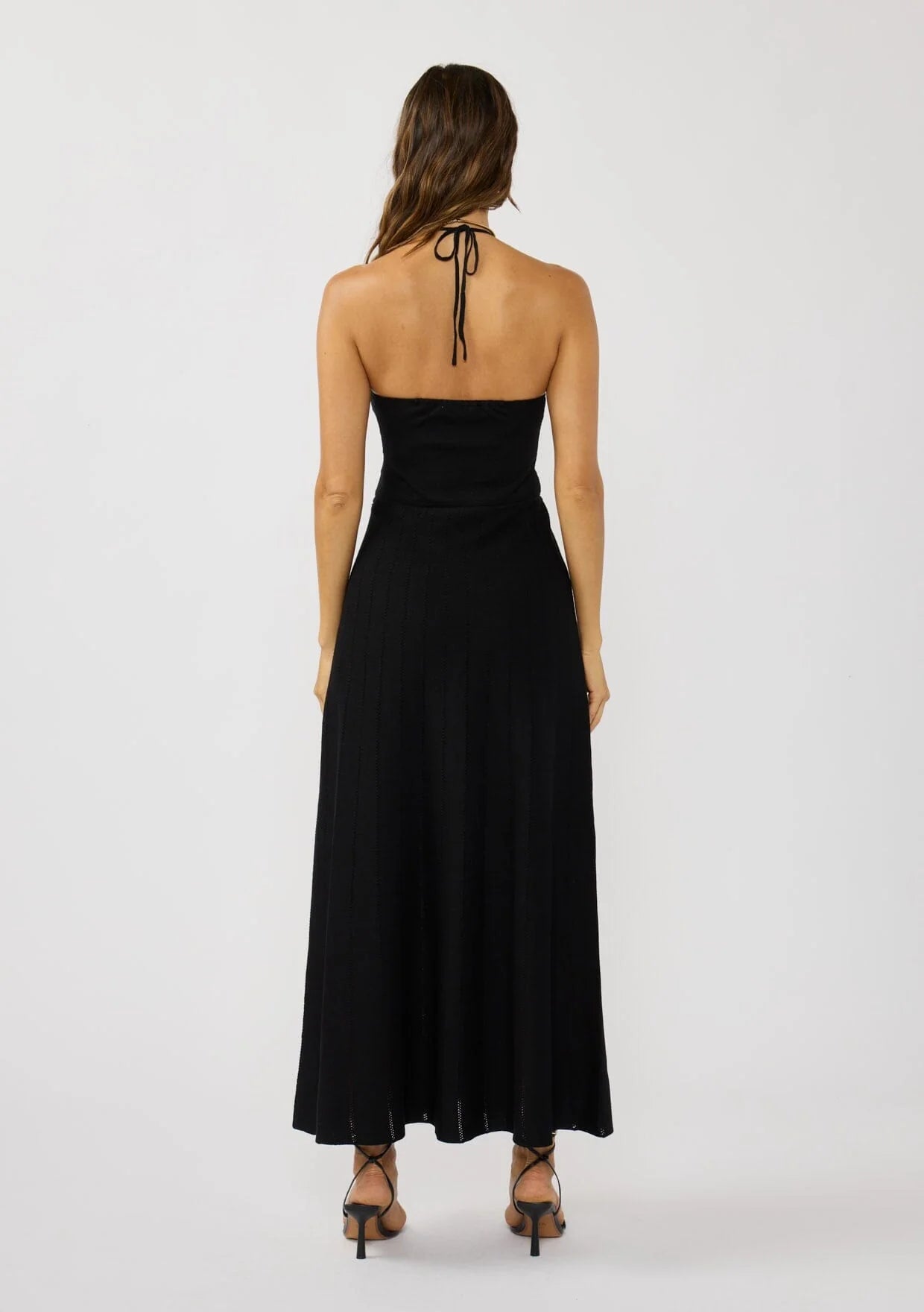 This black halter dress delivers effortless elegance with a modern, vacation ready feel. Featuring a chic cutout detail and a ruched bust, it offers a flattering fit through the top and a beautifully draped, flowy skirt. Crafted in a soft knit, it’s a twirl worthy style perfect for day to night wear.