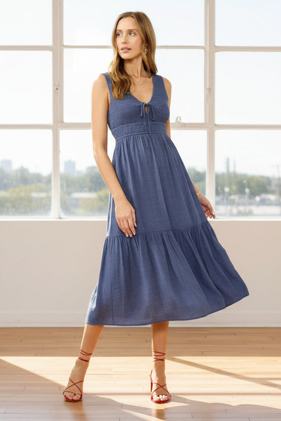 This timeless midi dress combines comfort and elegance with a slim-fit smocked bodice and an ultra-flowy skirt that moves with ease. The deep v-neckline with a delicate self-tie detail adds a romantic touch, making it perfect for everything from daytime strolls to evening gatherings. Its naturally relaxed silhouette offers effortless style all season long.