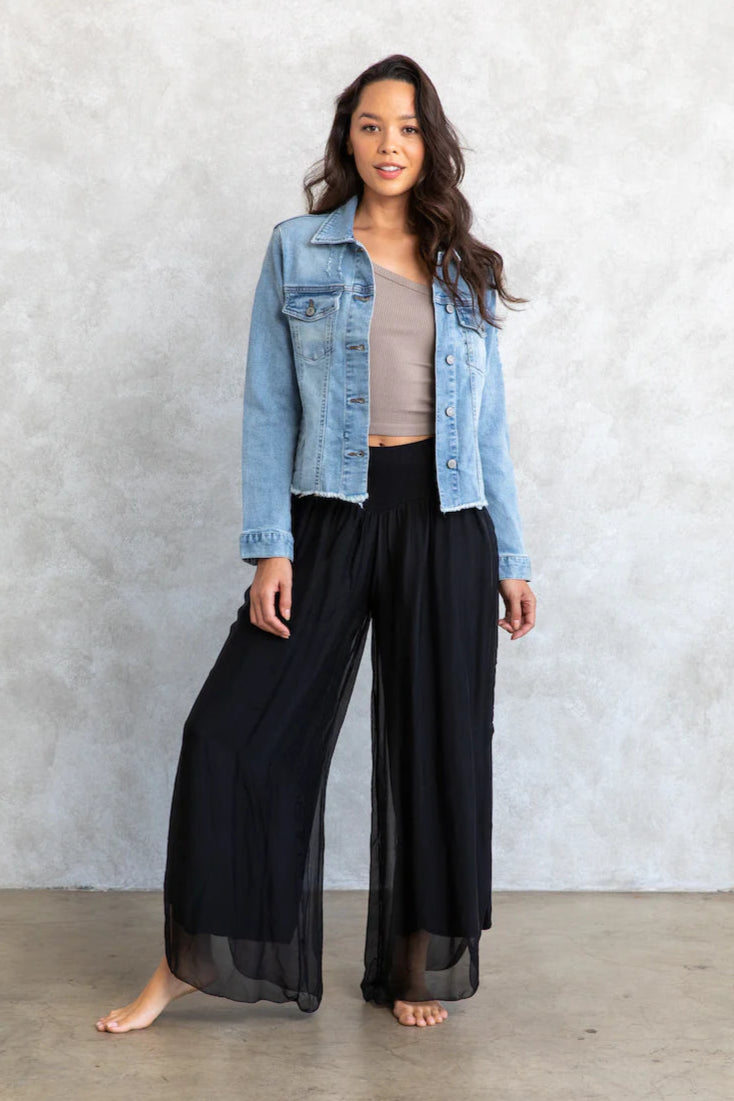 A must-have for summer! The silk blend feels soft to the touch and keeps you cool with all-day comfort. Featuring a flattering high waistband, a wide leg, and side slits that can be left open, or tied.