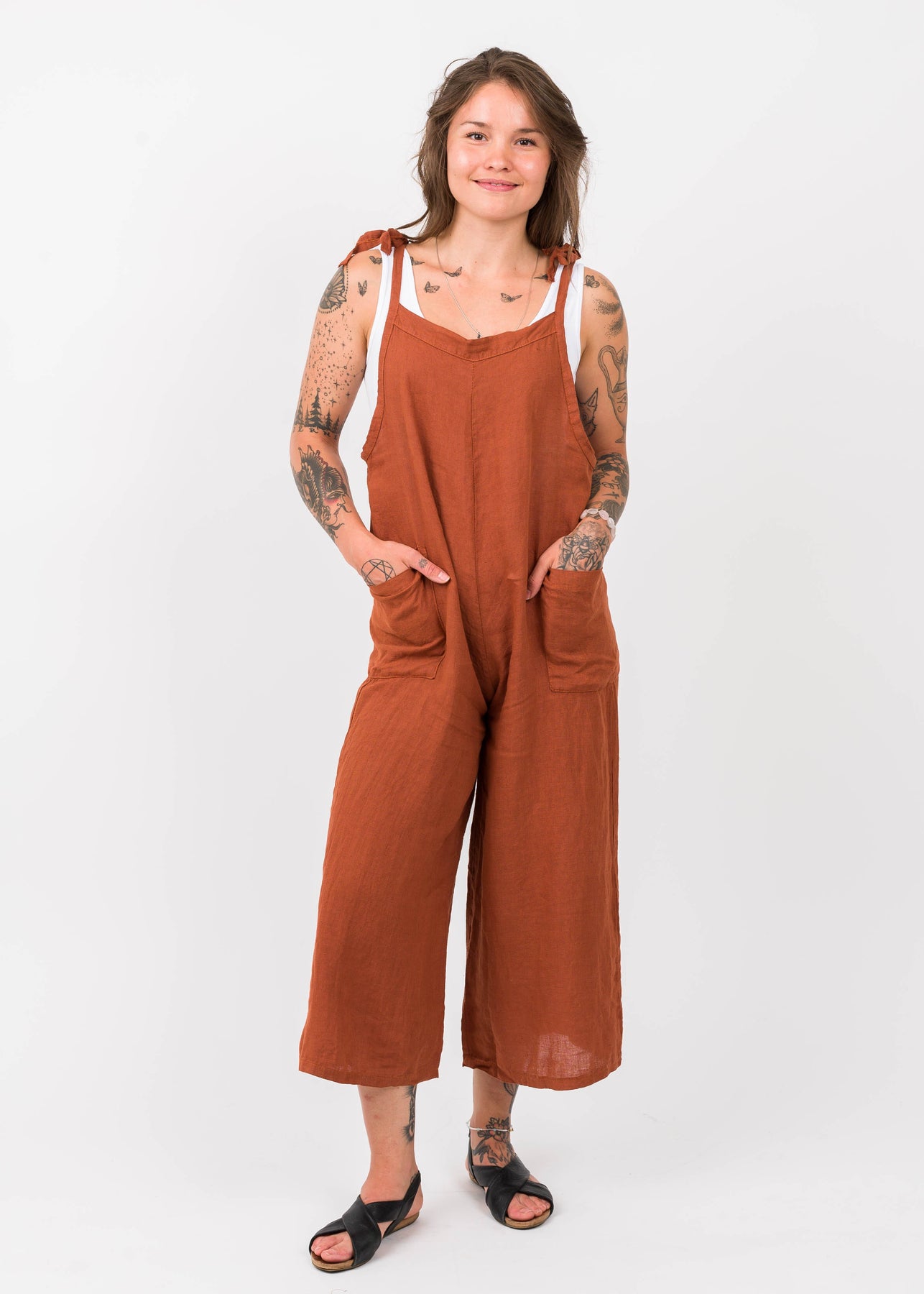 This comfy jumpsuit is crafted from 100% Italian linen and features adjustable bow-tie straps, pockets and a trendy wide leg. It's lightweight, breathable, and sure to be your new warm-weather favourite.