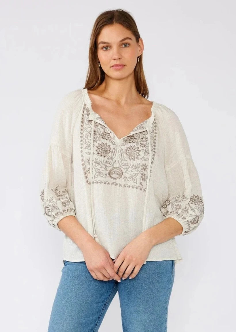 The Lovestitch Embroidered Peasant Blouse is a must-have addition to your spring and summer wardrobe. Featuring an intricate embroidered detail, with a split v-neckline, tassel ties, and exaggerated voluminous 3/4 length sleeves.