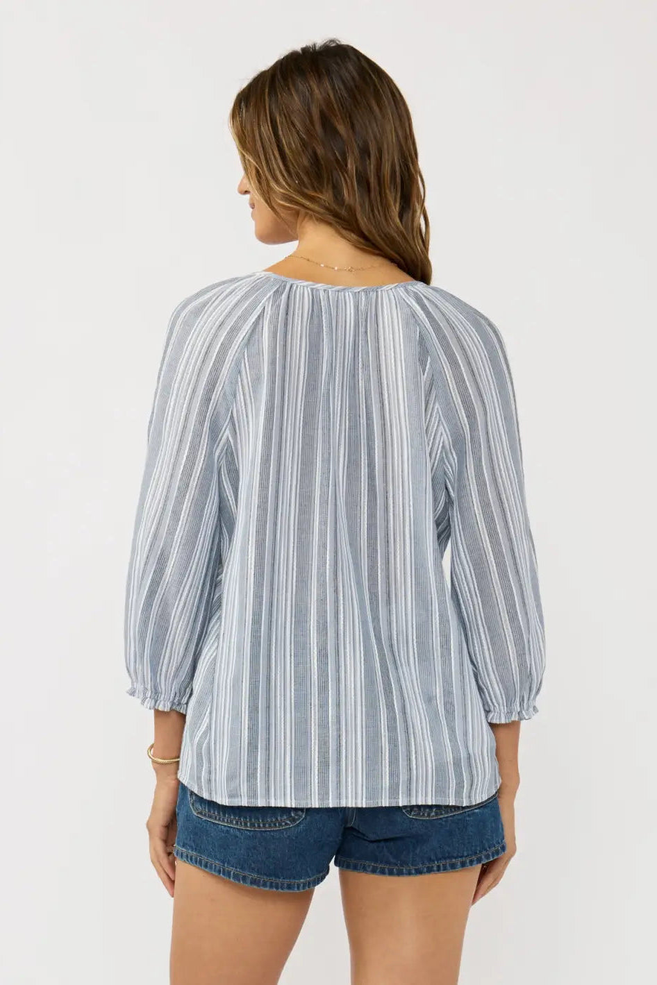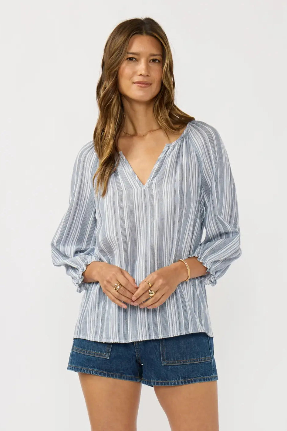 Elevate your everyday style with the Josephine Blouse. This spring essential features a chic split neckline, relaxed raglan sleeves, and subtle shirring for a flattering fit. Finished with ruffled cuffs and a touch of gold shimmer, it's lightweight, versatile, and endlessly wearable.