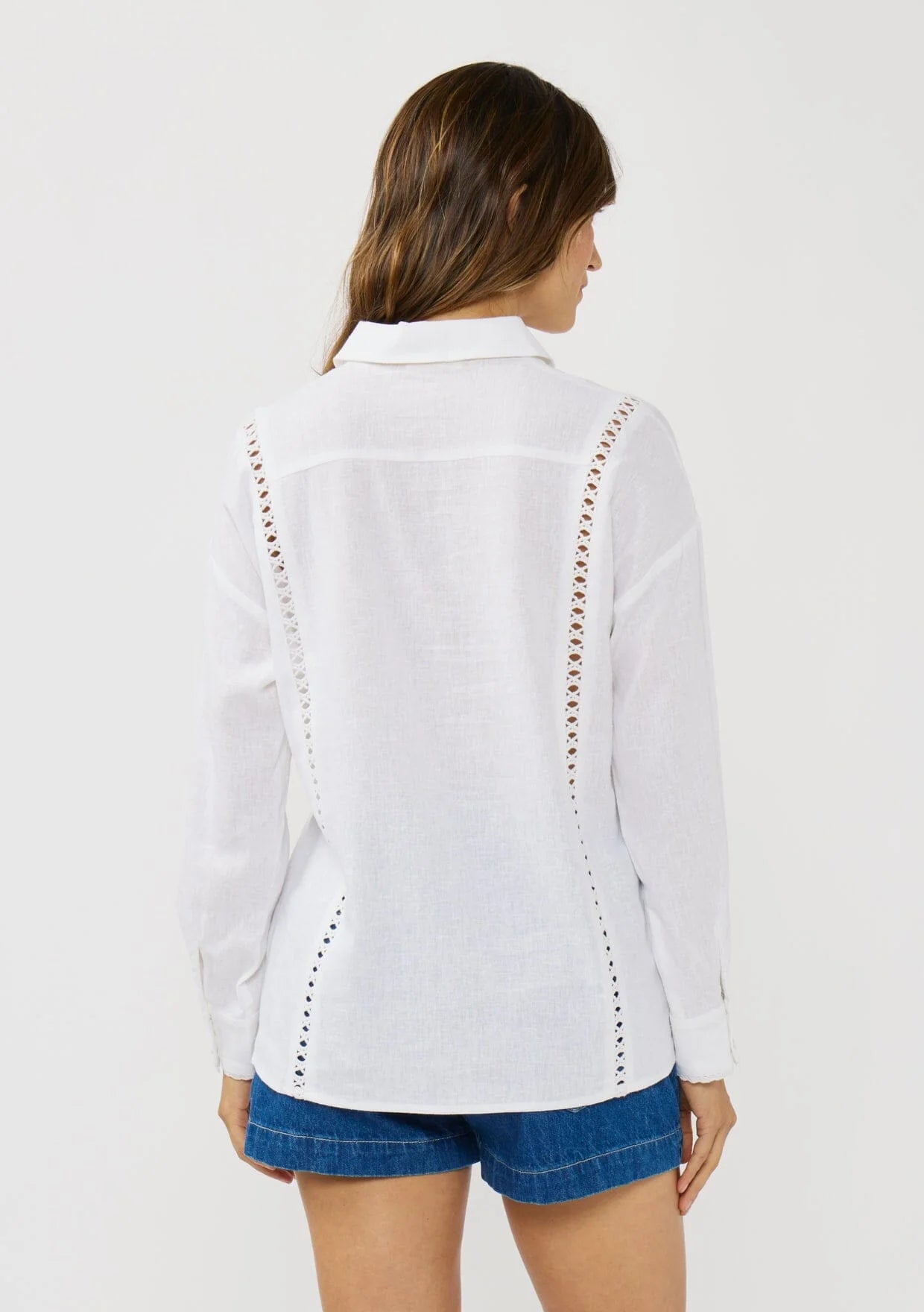 We love this delicate blouse for its intricate lace details and classic charm. Designed with a half-button front, a collared neck, and button cuffs, it’s the timeless piece that instantly elevates any denim look. Whether tucked in or worn loosely, this linen-blend style adds a unique, versatile touch to your everyday wardrobe.