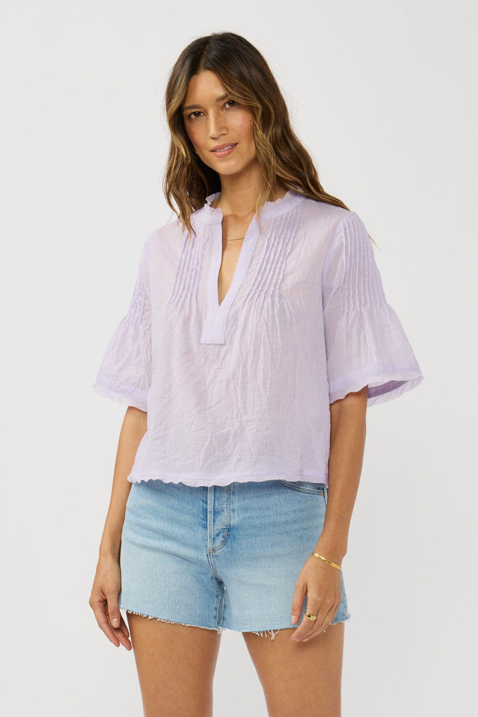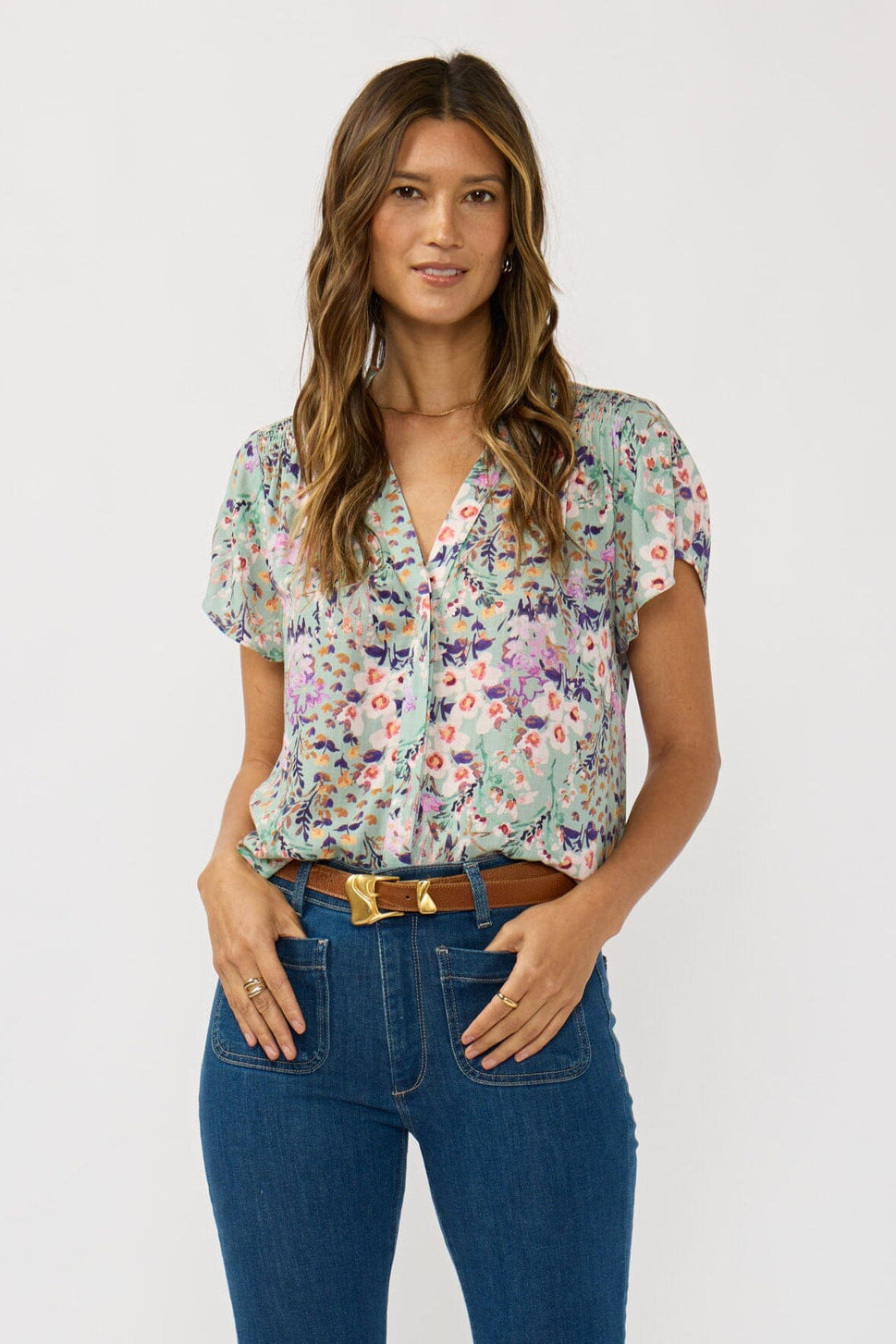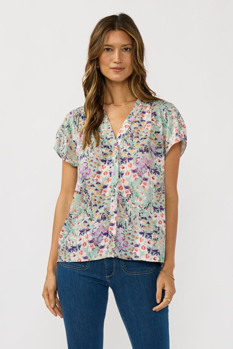 This classic top stands out with its effortless fit and delicate floral eyelet design, making it a spring essential inspired by the season’s first blooms. Designed with a chic button-front detail, half-length sleeves, and a delicate scalloped hem, this breezy piece pairs well with denim for a relaxed everyday look.