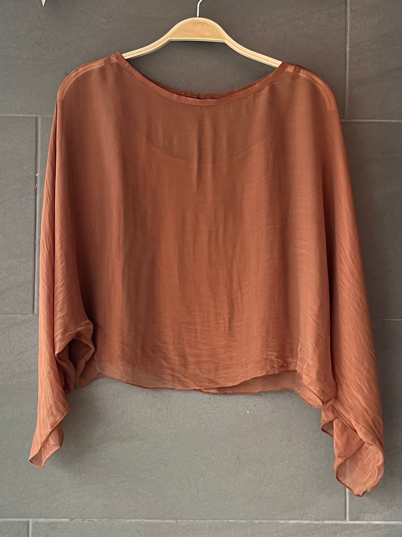 This elegant Meo Silk Dolman Top features a flattering boat neckline and relaxed dolman sleeves for a comfortable fit. The included slip tank adds an extra layer of comfort, making this top perfect for any occasion.