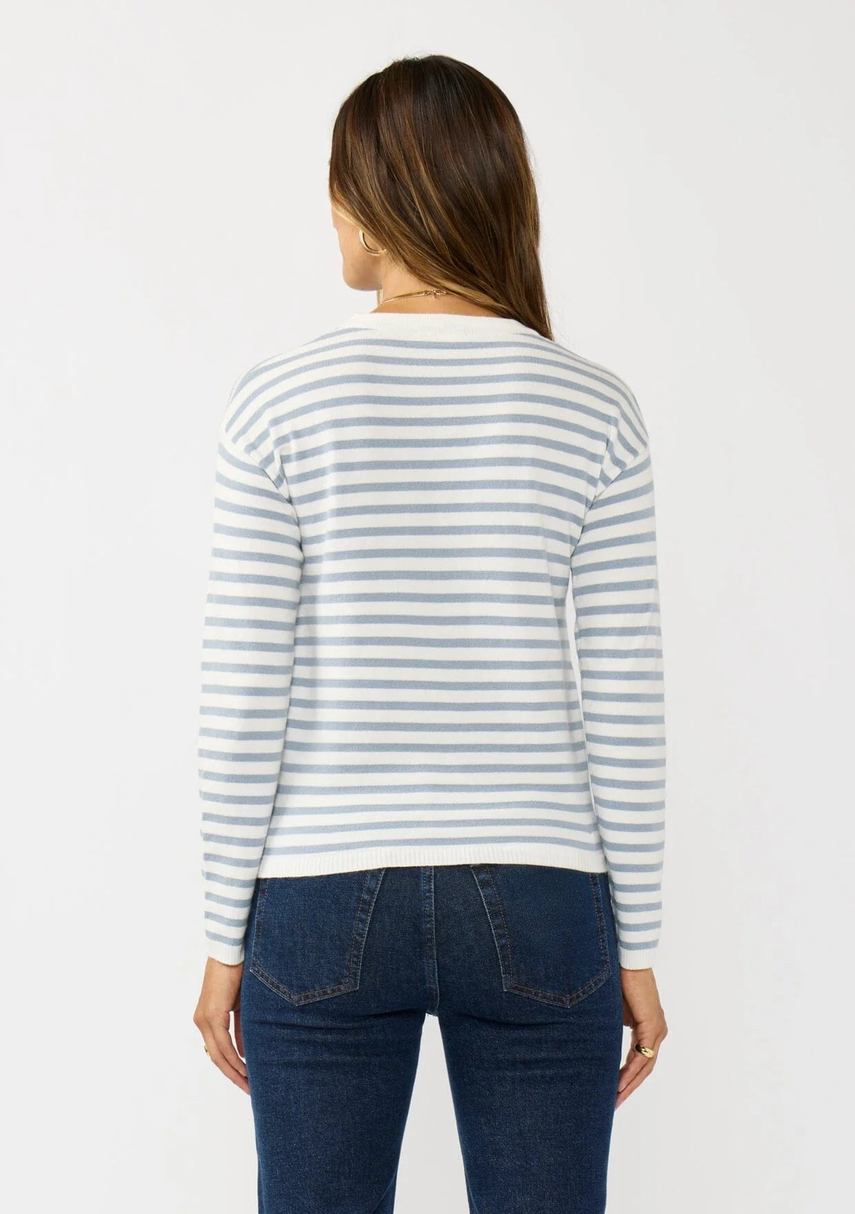 A classic striped knit pullover with a twist! Our timeless lightweight pullover features a crew neckline, long sleeves with a dropped shoulder, and a unique twist front detail at the waist. Perfect for spring and beyond, this effortlessly chic striped sweater pairs well with denim.