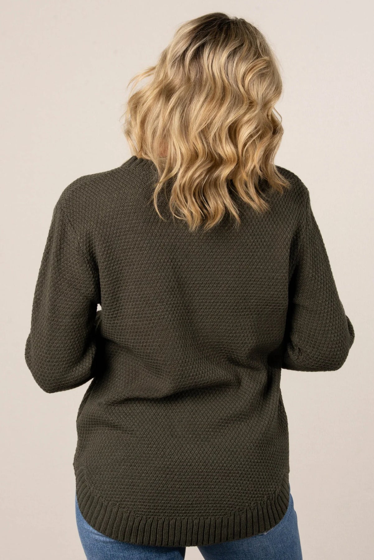 This cozy sweater is made from a lightweight waffle material with a round neckline, ribbed trim, and high-low finishing. Wear with your favourite tank and jeans for an easy, casual Fall outfit.