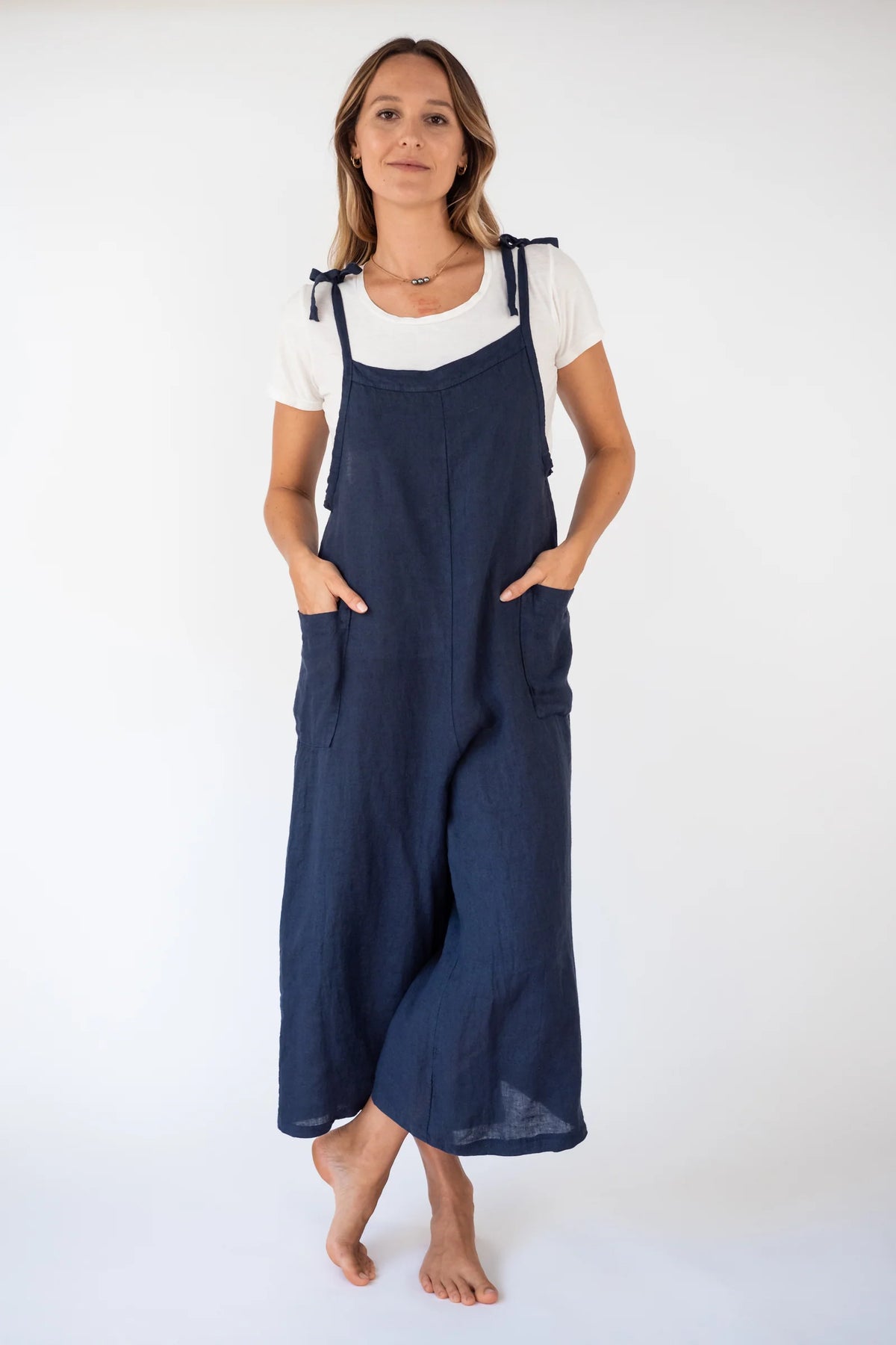 This comfy jumpsuit is crafted from 100% Italian linen and features adjustable bow-tie straps, pockets and a trendy wide leg. It's lightweight, breathable, and sure to be your new warm-weather favourite.